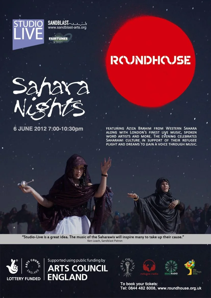 The Roundhouse in Camden provided in-kind support to Sandblast offering its Studio-Theatre to host the multi-arts Sahara Nights extravaganza on June 6th 2012. Filled to the brim with an audience of over 200 people, it was organised in collaboration with Fairtunes and Lyrix Organix and was funded by Arts Council and promoted by Refugee Radio.