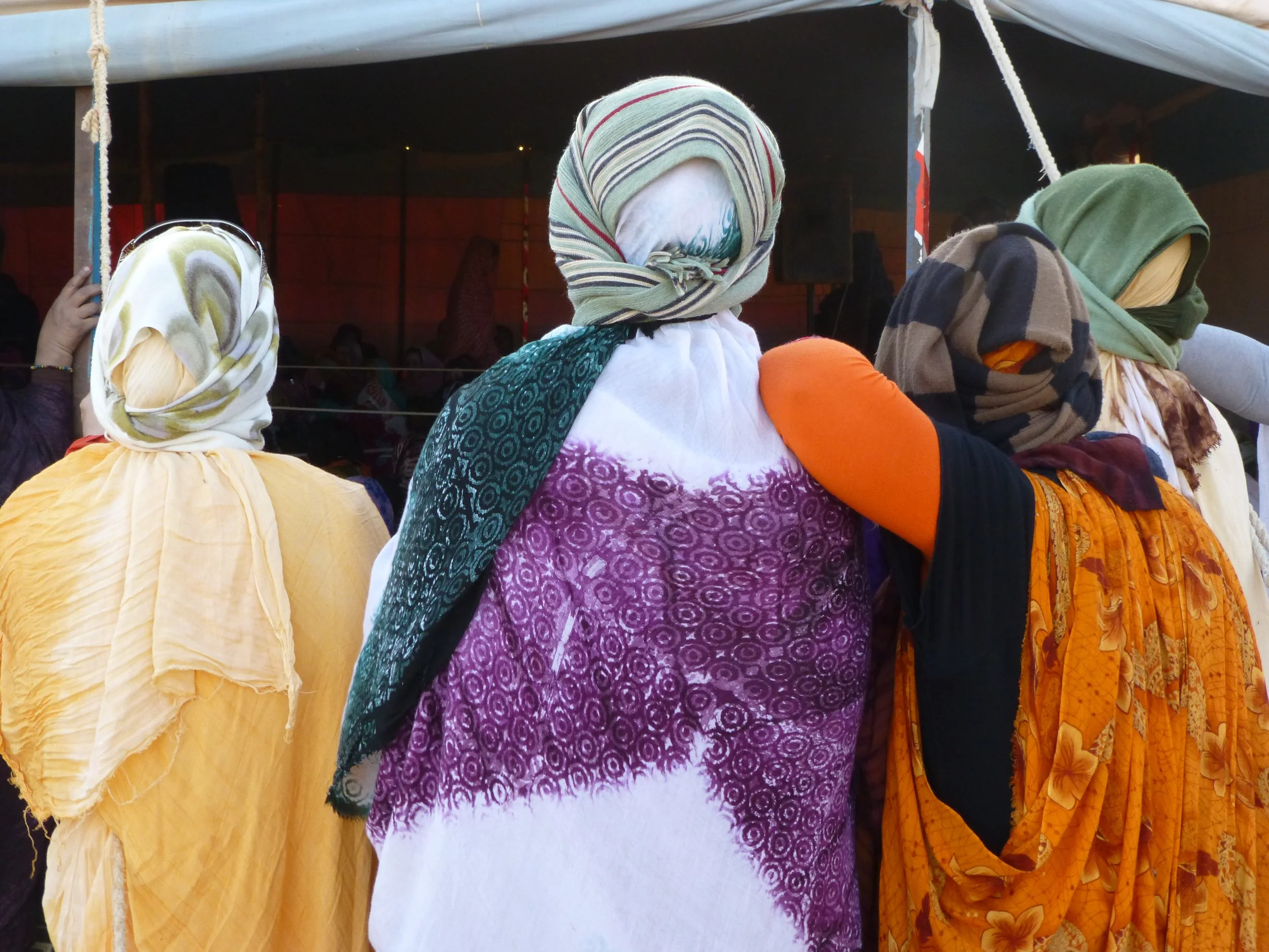Three saharawi women wearing traditional clothing walking on sandy terrain towards a desert village with small, flat-roofed buildings under a blue sky in Western Sahara